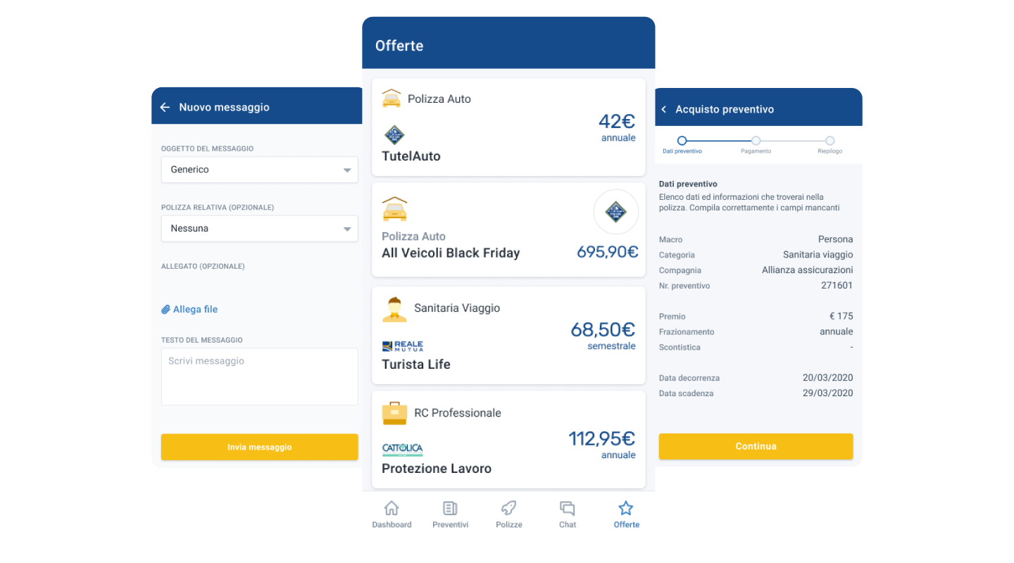 è una piattaforma multicanale nata per semplificare la gestione delle polizze assicurative, riunendo in un unico ambiente digitale clienti, intermediari e compagnie. Moku ha accompagnato il fondatore nel percorso di creazione della startup, curando analisi, design e sviluppo del software. Il risultato è un ecosistema web e mobile integrato con sistemi esterni — gestionale assicurativo, firma digitale e Stripe per i pagamenti elettronici — che consente di gestire, acquistare e firmare polizze in modo semplice, sicuro e centralizzato.
